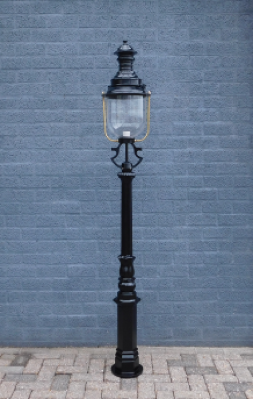 Diese schöne Laterne ist aus Aluminiumguss mit einer wetterfesten, sehr hochwertigen Lackierung in schwarz gefertigt und ist praktisch unvergänglich. Der historische Charakter dieser charmanten Außenlampe wird durch ihre Form und Farbe unterstrichen.