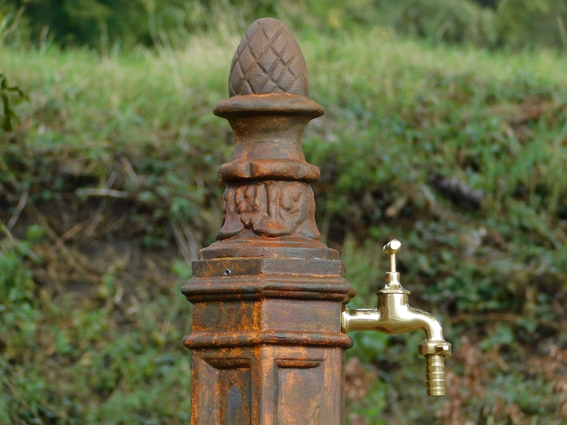 Der Gartenbrunnen wird mit einem Wasserhahn aus Messing geliefert.