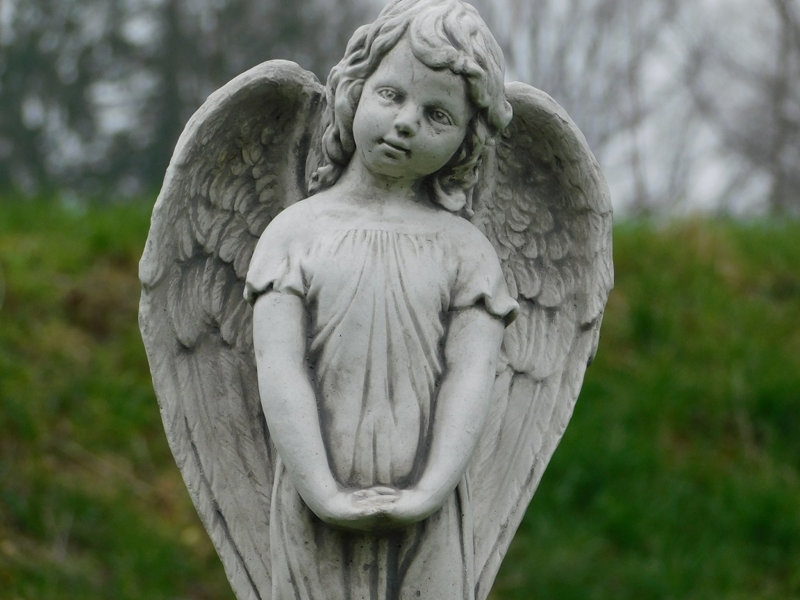 Der Engel mit den zusammengefalteten Händen und dem Blick nach vorne strahlt Ruhe und Frieden aus.