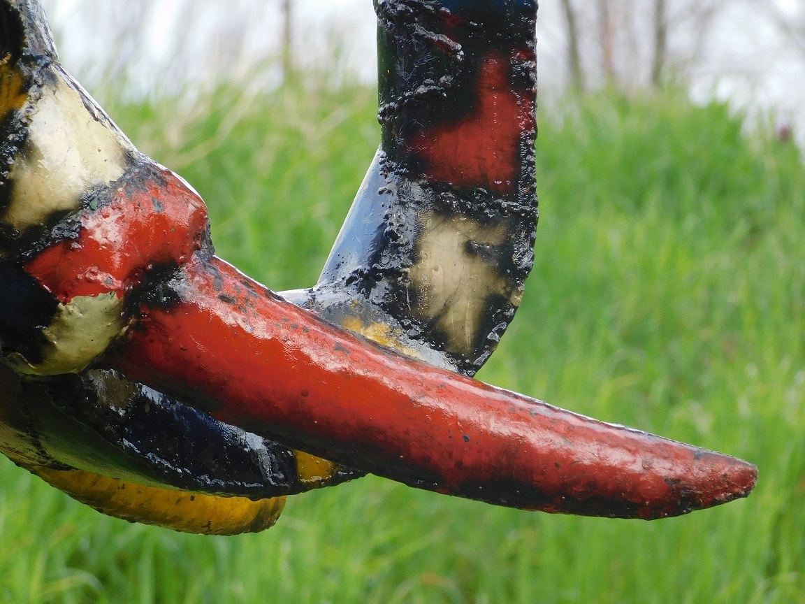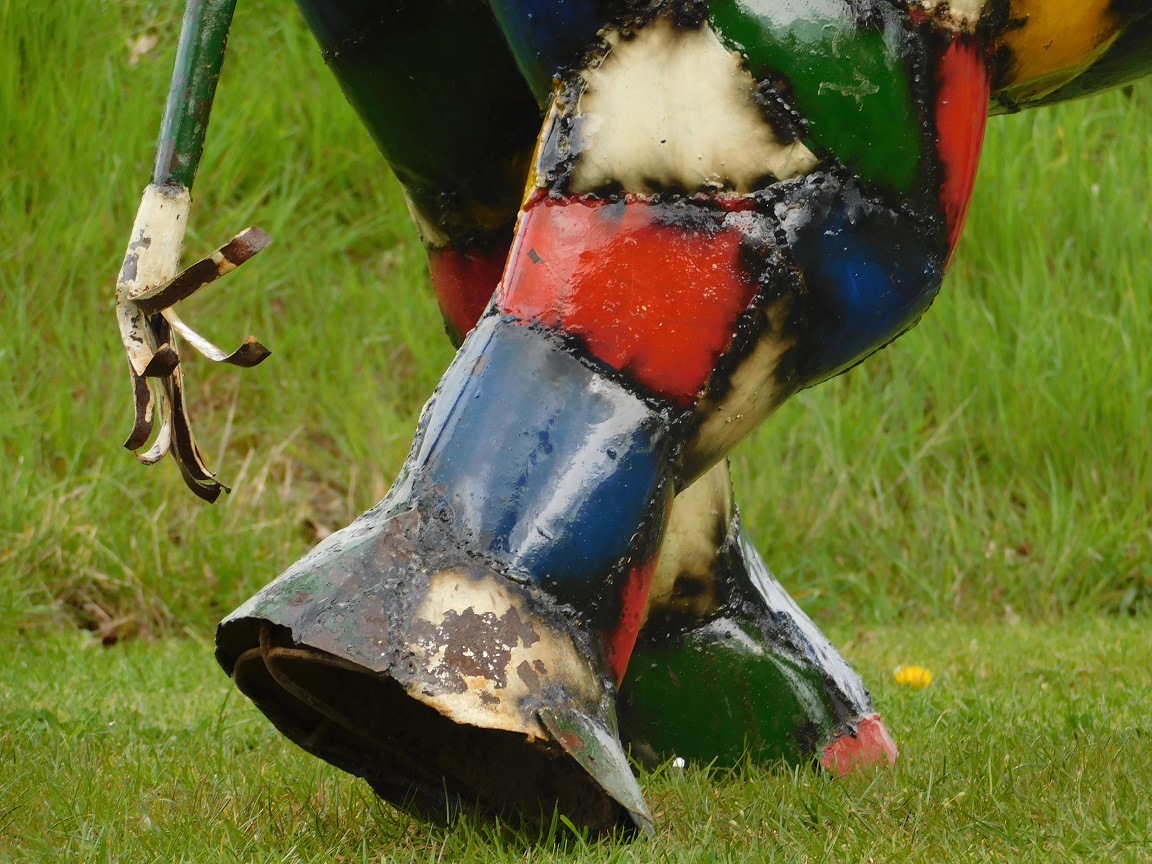 Die sichtbaren Schweißnähte und die farbenfrohen Muster verleihen dem Kunstwerk einen authentischen und handwerklichen Charakter.