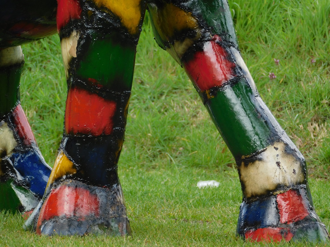 Die leuchtenden Farben, die robuste Form und die kunstvolle Verarbeitung verleihen dieser Skulptur eine kraftvolle und zugleich verspielte Ausstrahlung.