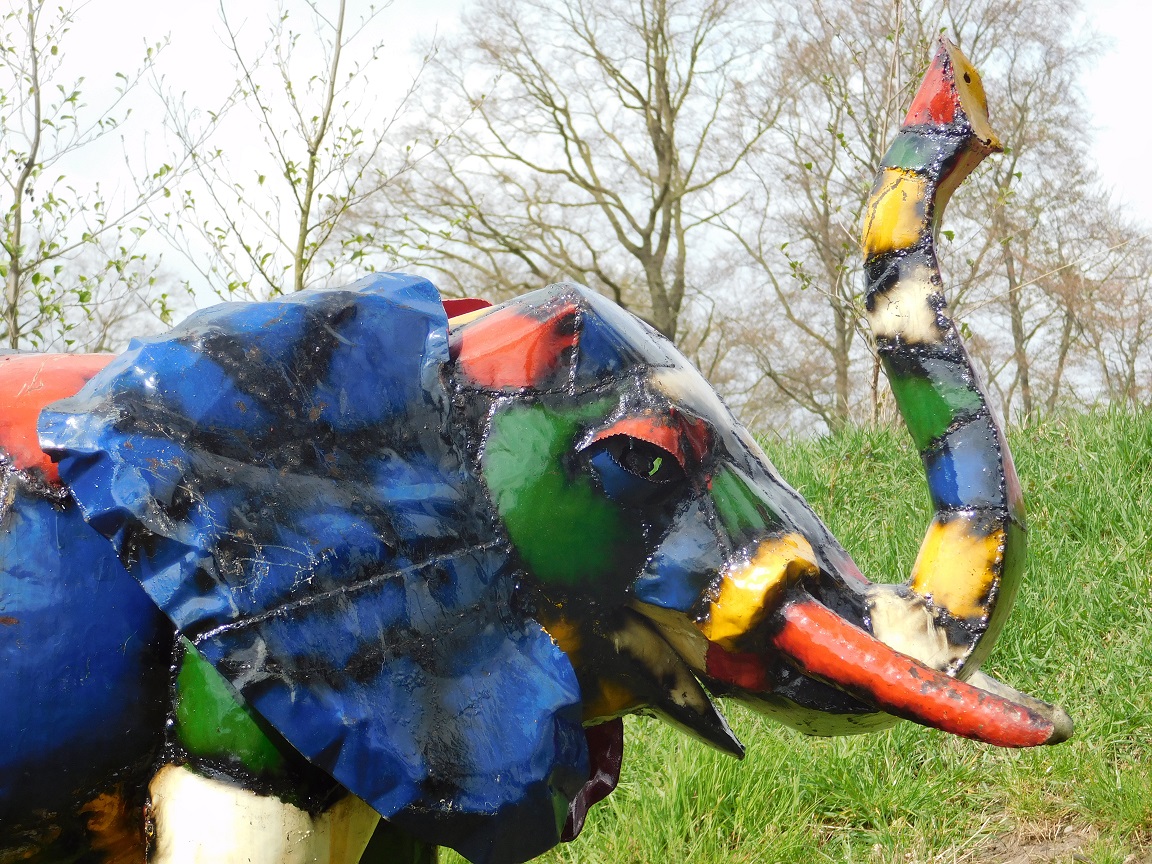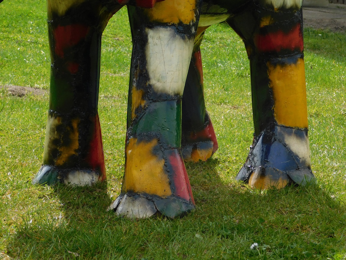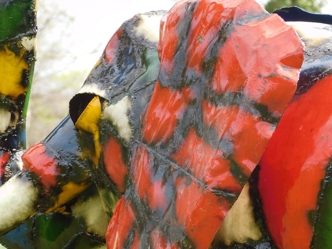 Die sichtbaren Texturen, Schweißnähte und farbenfrohen Muster verleihen dem gesamten Kunstwerk einen authentischen und künstlerischen Charakter.