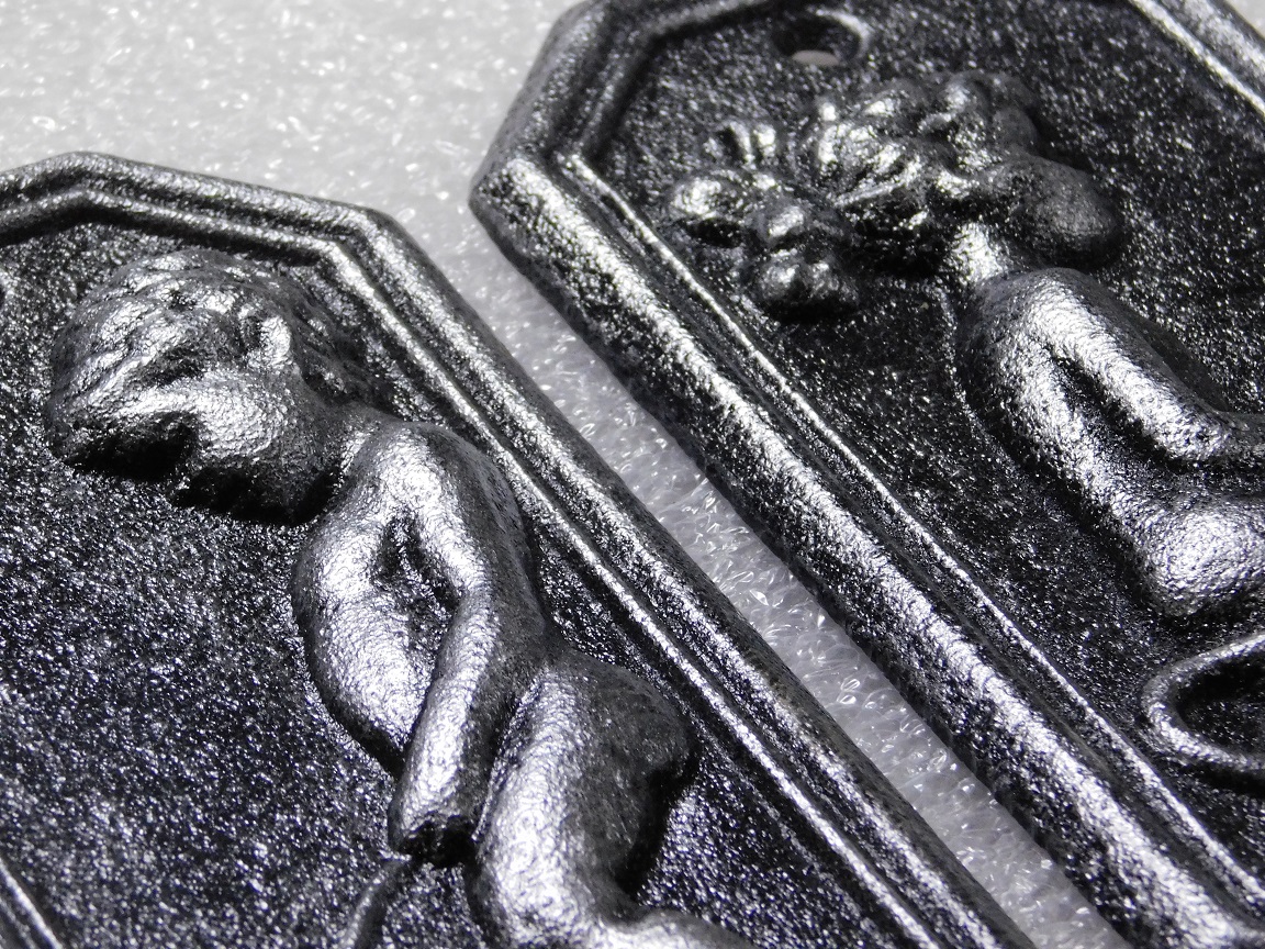 Verleihen Sie jedem Toilettenraum mit diesen Toilettenschildern aus Gusseisen (Mann & Frau) in authentischer Old Silver-Optik einen stilvollen, klaren und charaktervollen Look.
