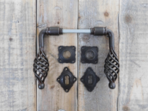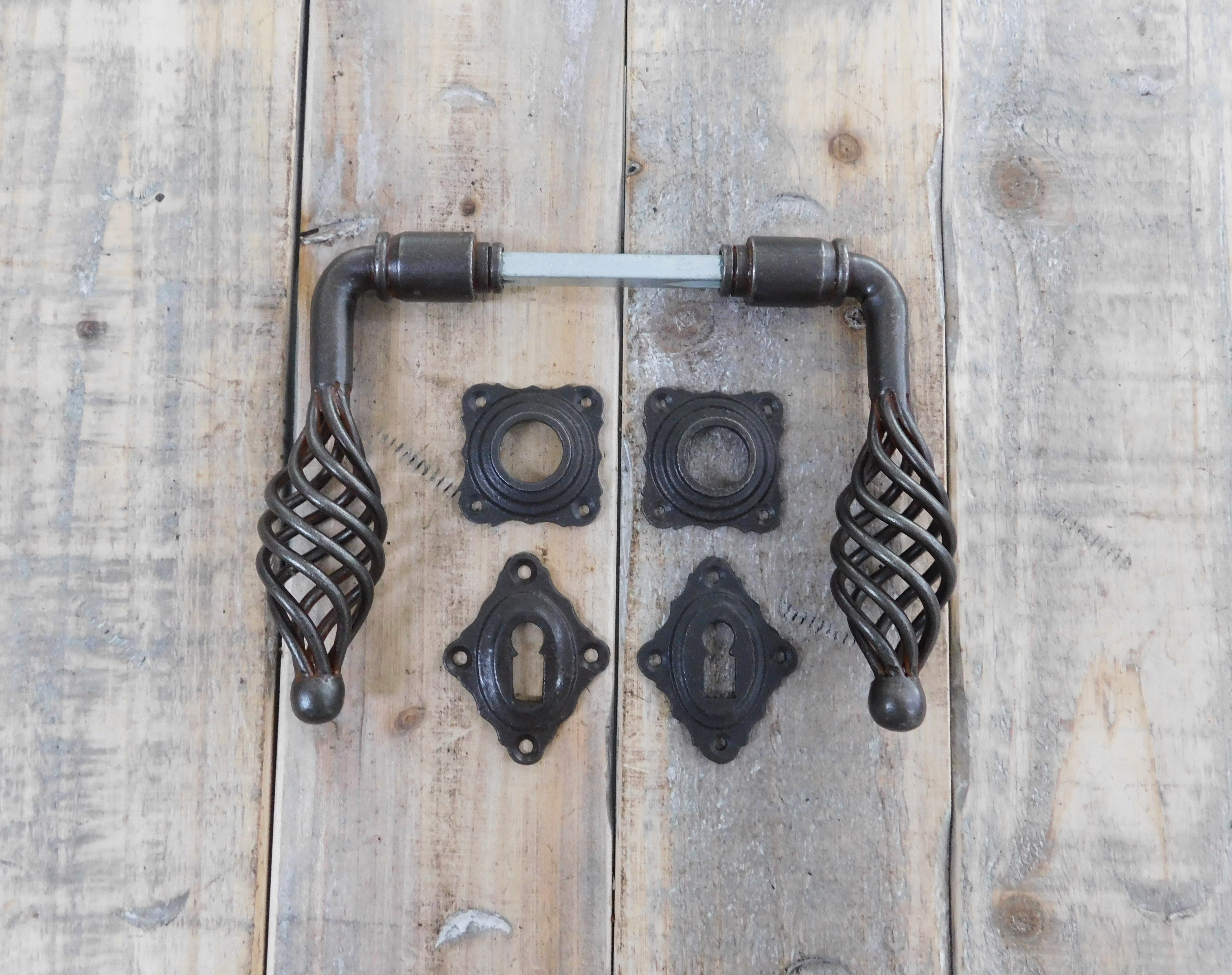 Schöner Satz antiker Eisentürbeschläge bestehend aus: Drückergarnitur, Drückerstift, 2 Klinkenrosetten und 2 Schlossrosetten BB.