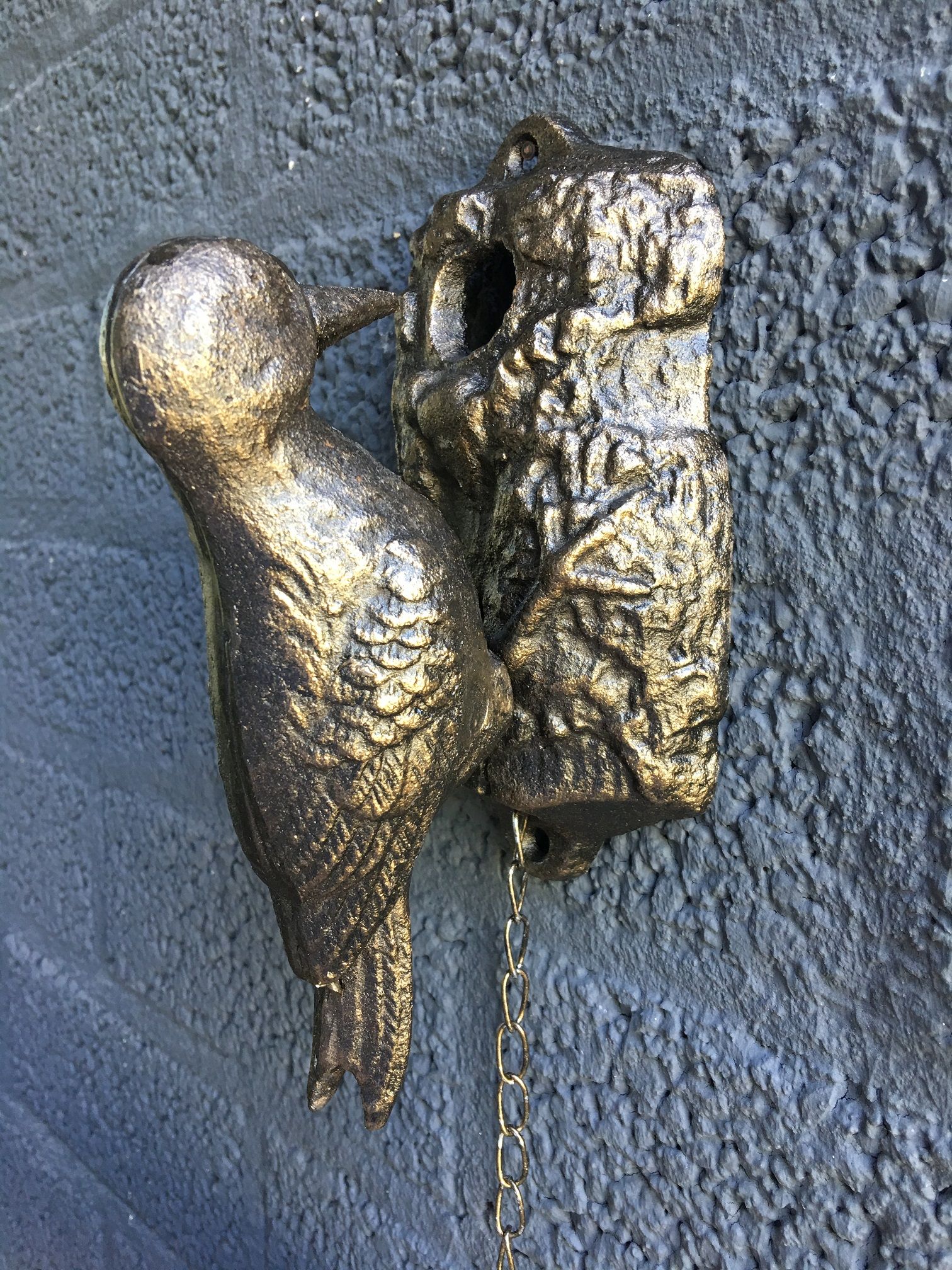 The ingenious design makes a graceful woodpecker knock on your door as soon as you pull the pull chain.