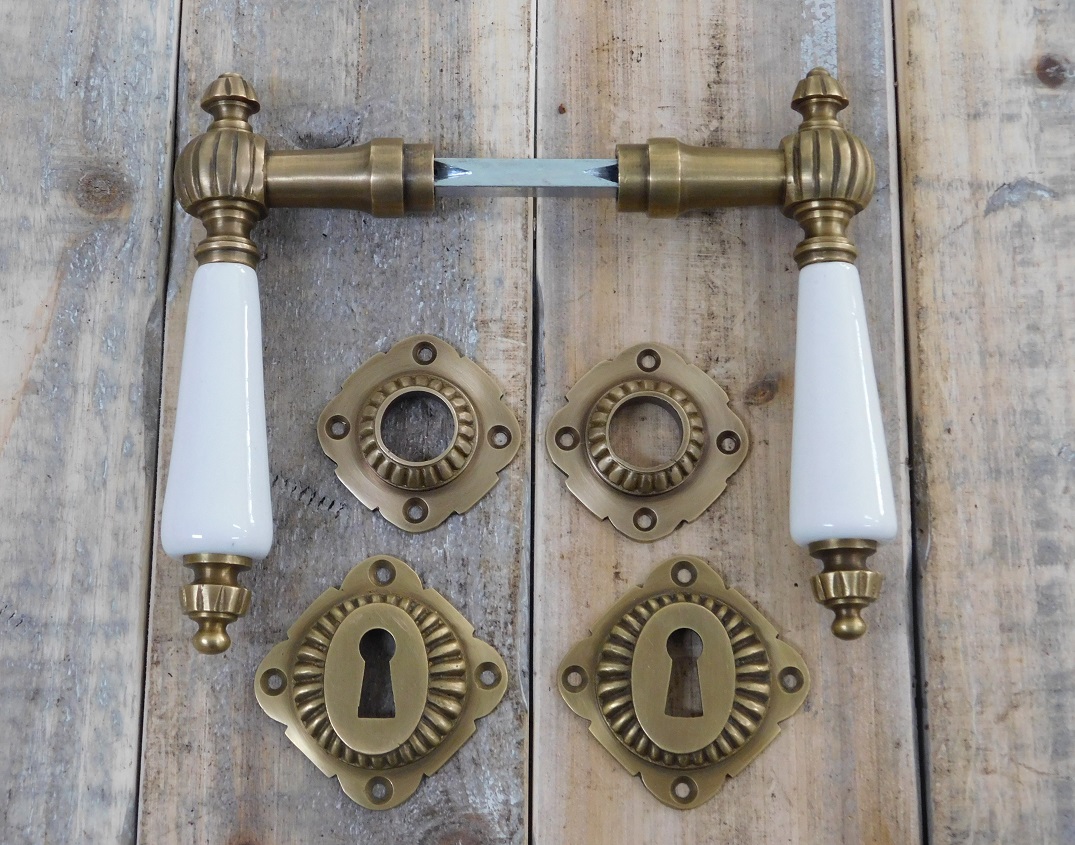 Beautiful set of top quality door hardware. Fully patinated brass with porcelain handles.