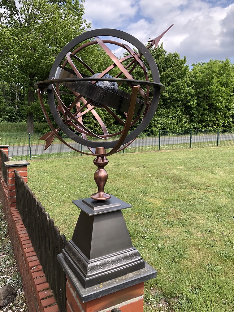 This sundial is of high quality, made of brass. The base has a brass/copper colour and is made of aluminium. The sundial has earth as centre and around it a system of lines which you can adjust as you please. These lines represent the other planets revolving around the earth, as was thought in earlier times (geocentrism). It is a beautifully made and interesting sundial and an attractive garden decoration.