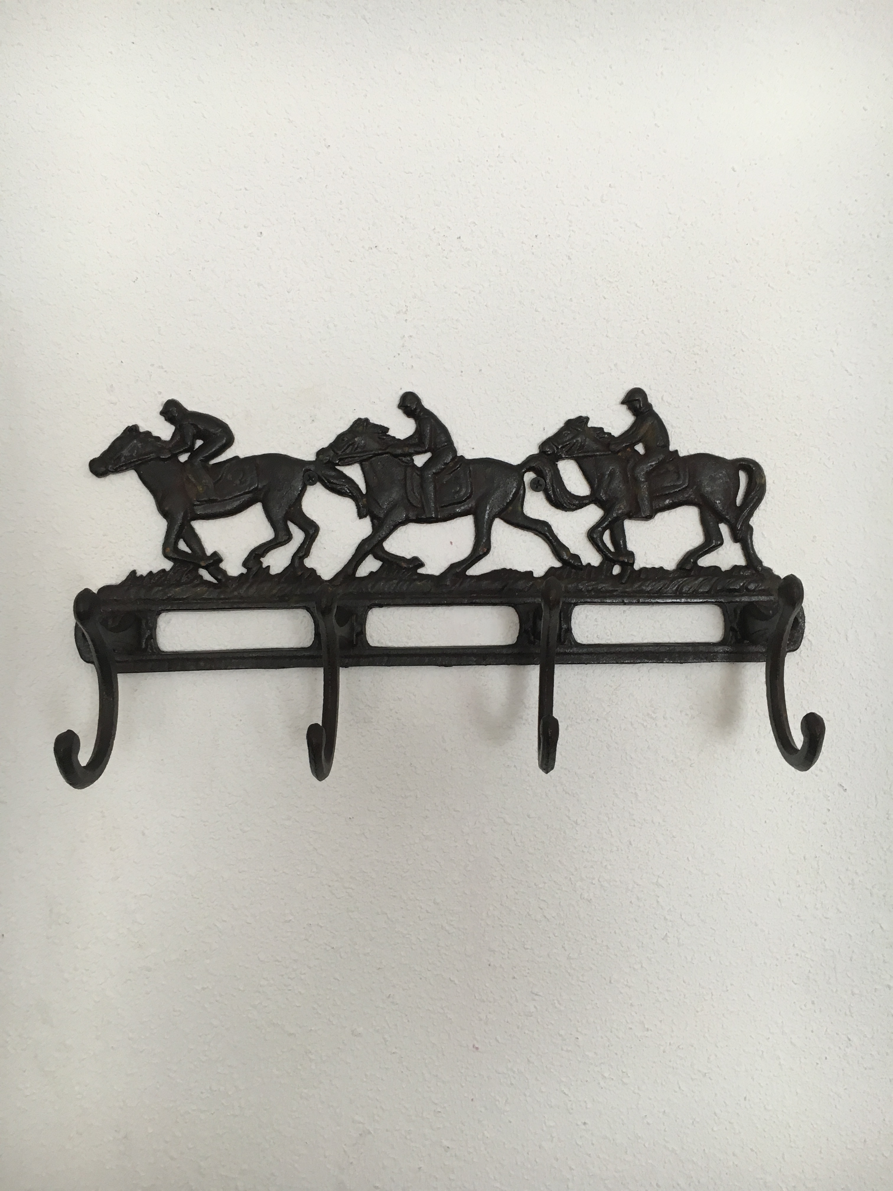 A nice and very sturdy coat rack with 8 hooks, decorated with horses.