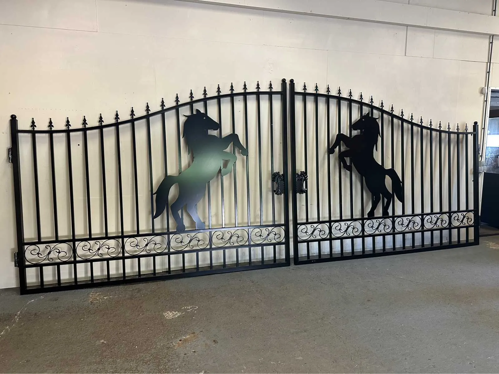Stunning black wrought-iron gate – 433 cm wide – featuring a rearing horse.