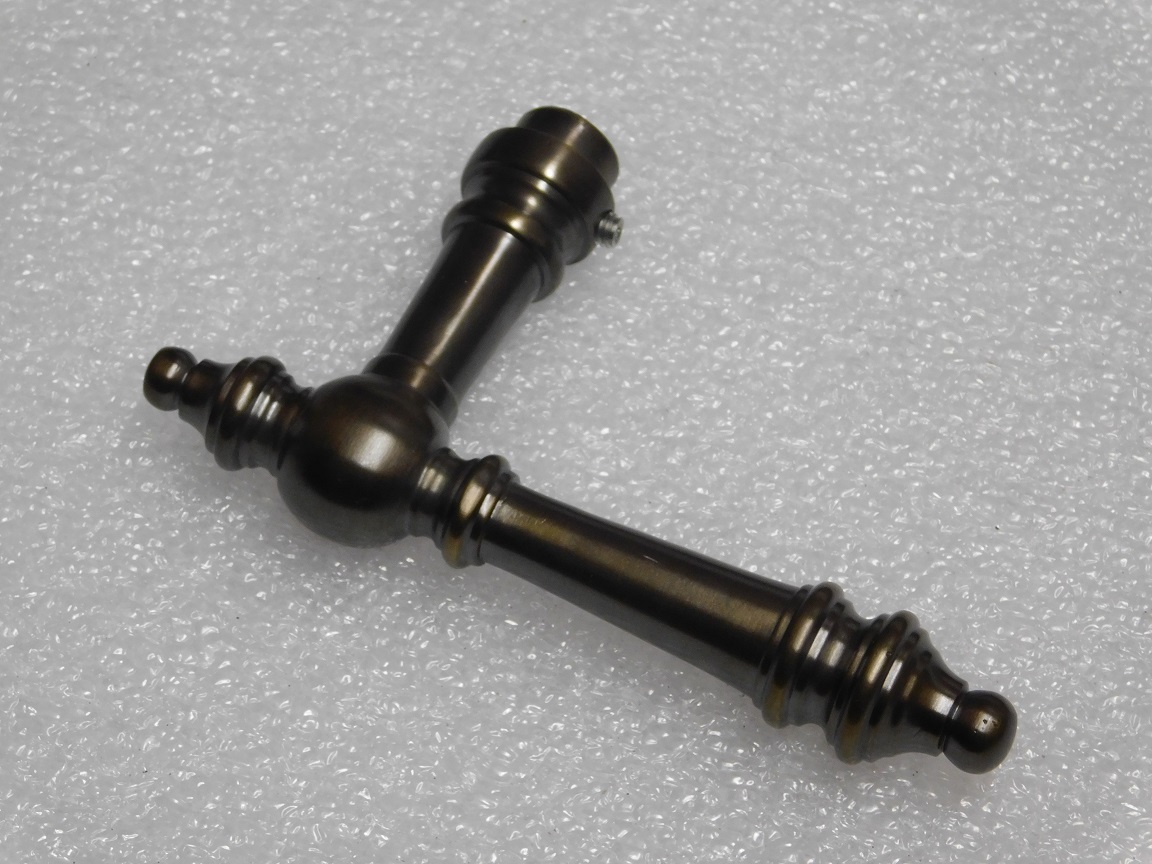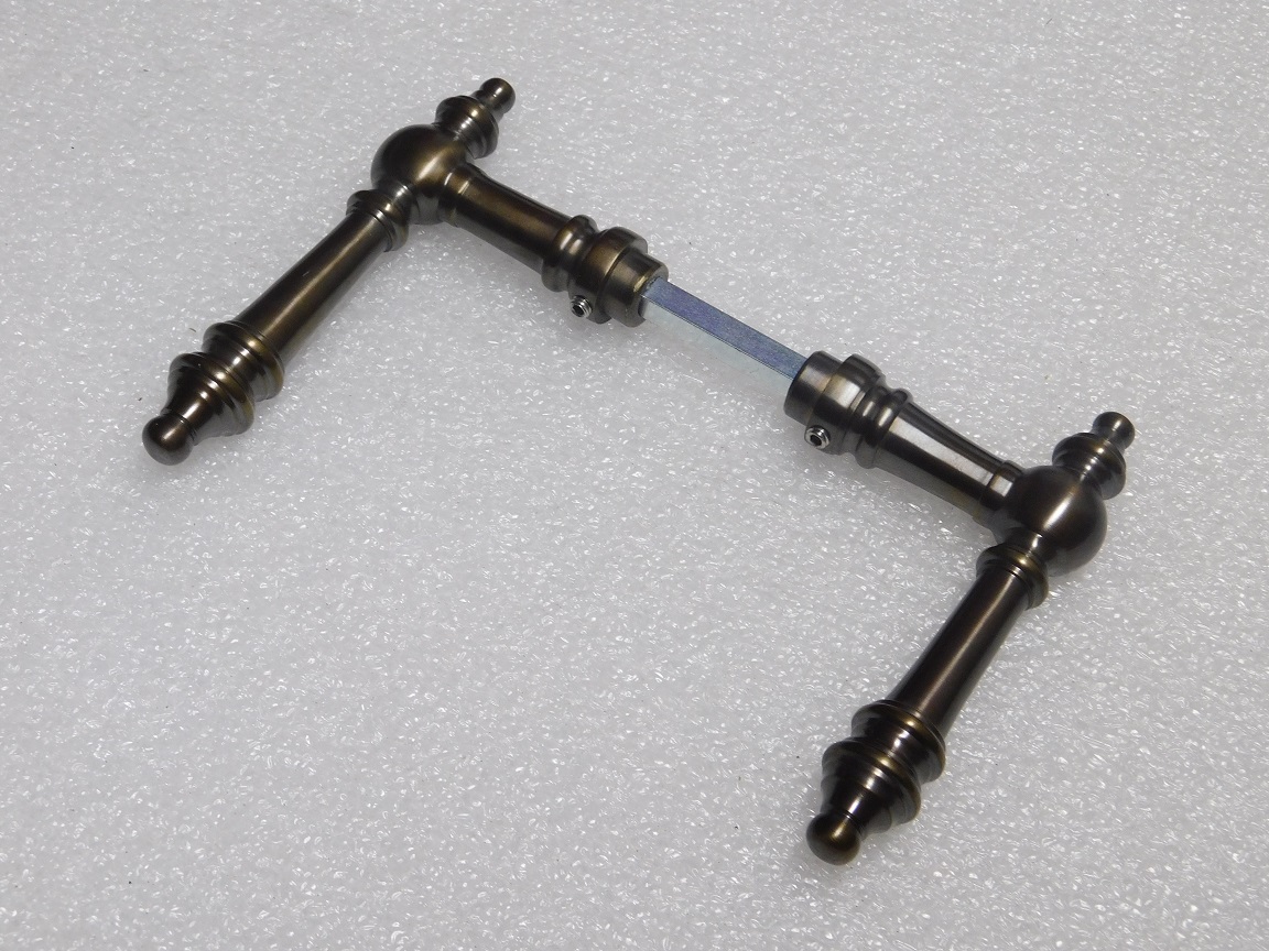This set is crafted from solid brass and features a dark patinated finish.