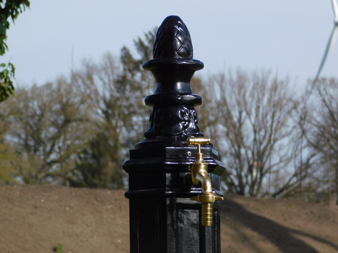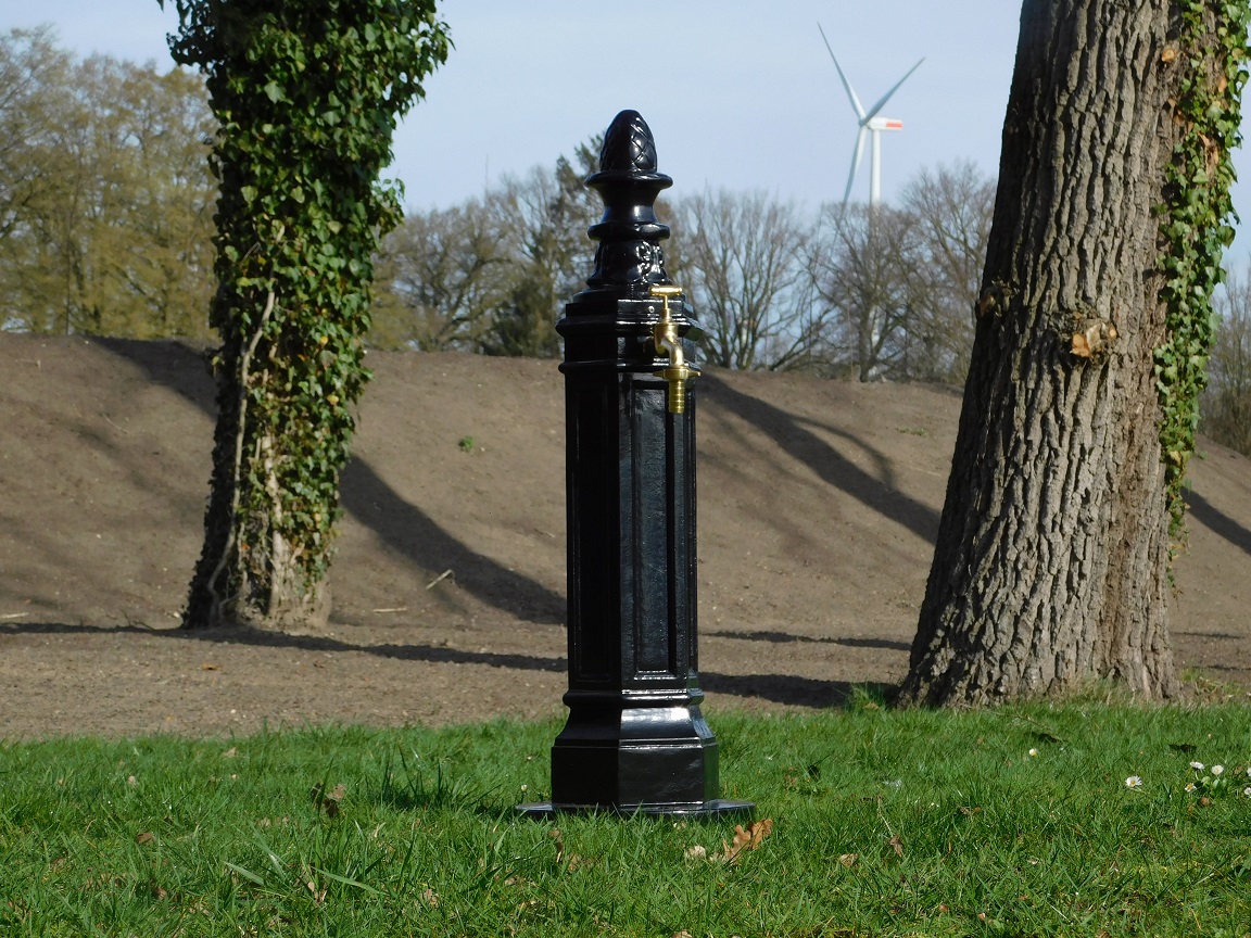 Classic standing water tap, made of aluminium in black, with a brass faucet.