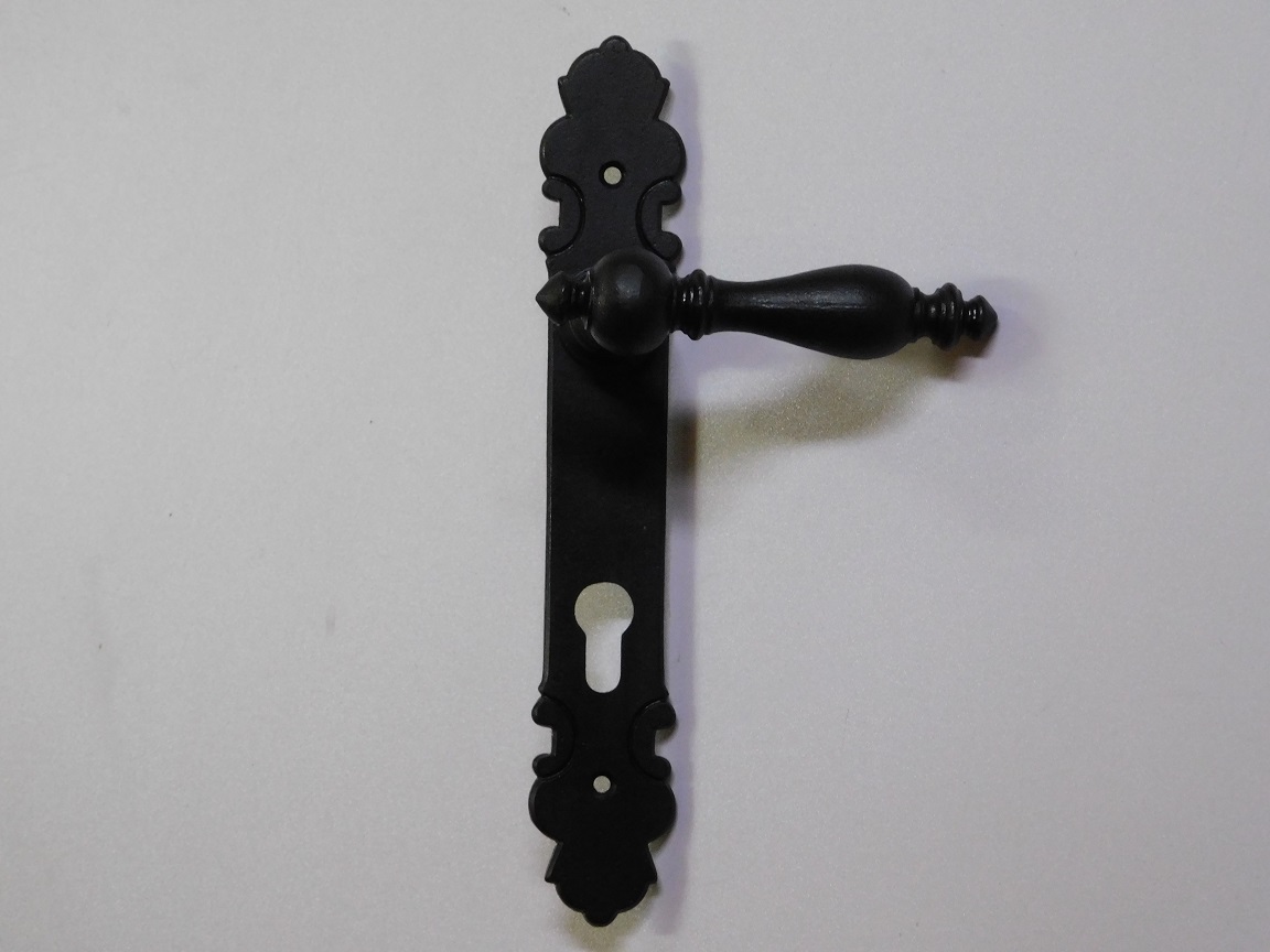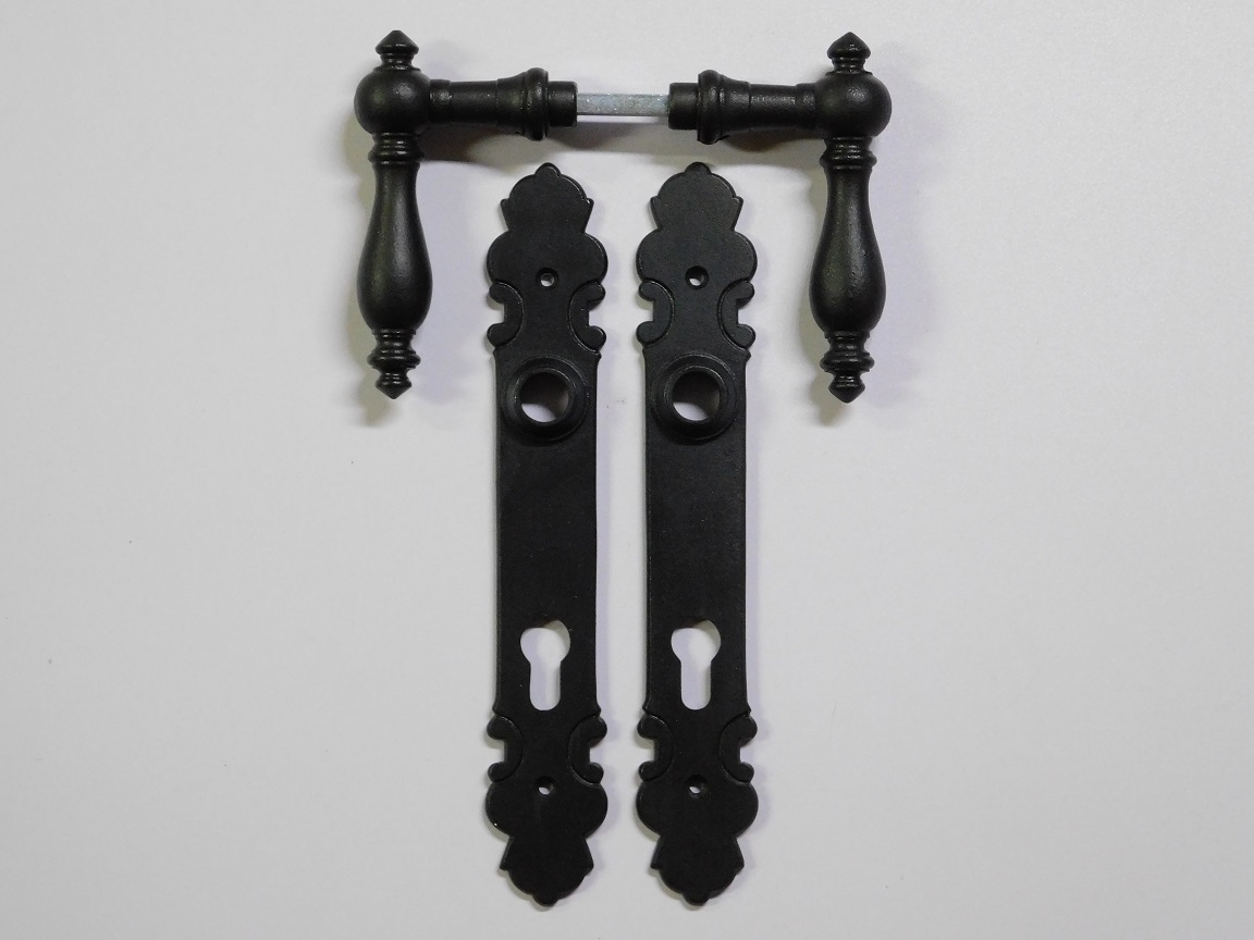 De set bestaat uit twee sierlijk gevormde klinken en twee bijpassende deurplaten (langschilden) met sleutelgat. (PC 92)