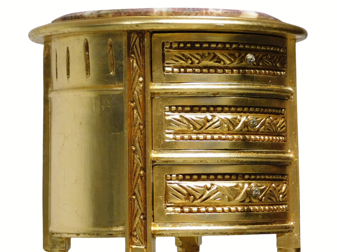 Het marmeren blad ligt er los op en vormt een prachtig contrast met het goudkleurige hout en geeft het meubel extra klasse en duurzaamheid.