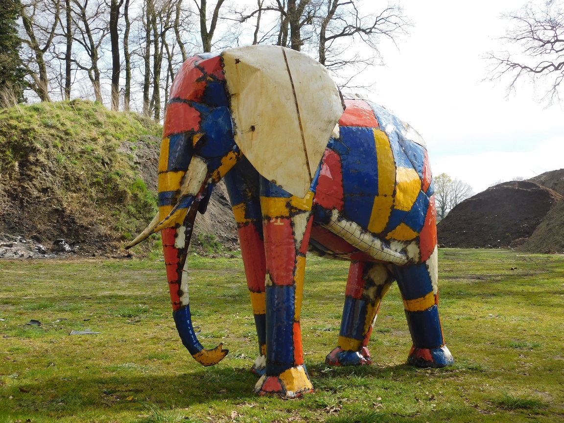 Deze XXL handgemaakte olifant is een spectaculair kunstobject dat direct alle aandacht naar zich toe trekt.