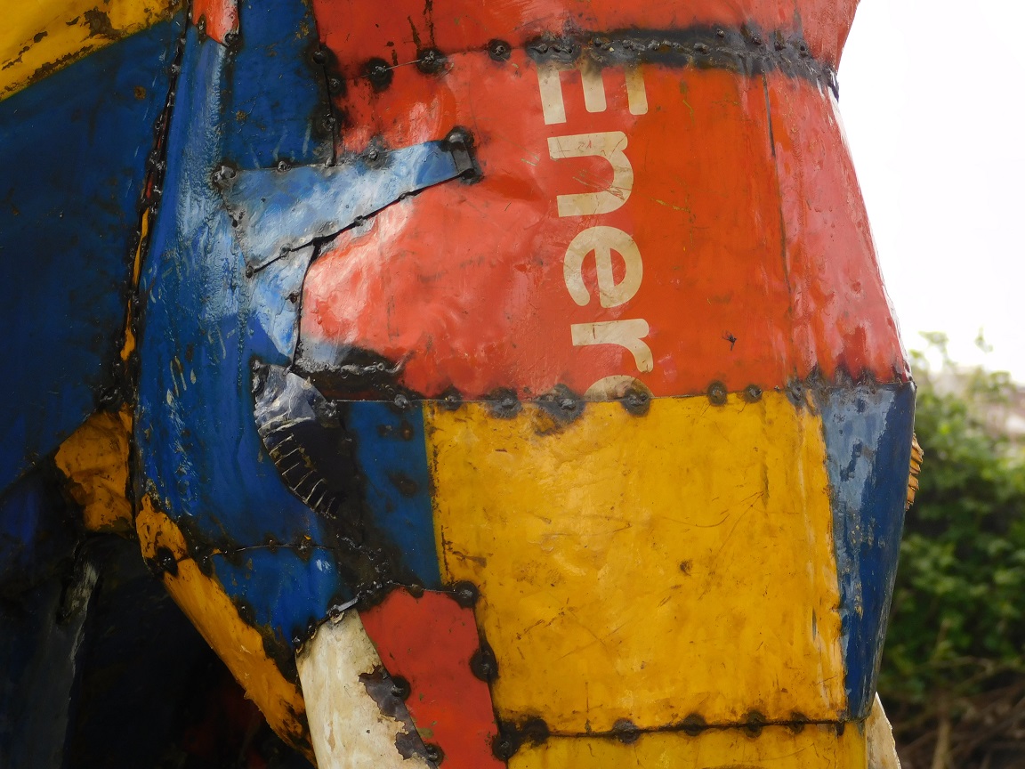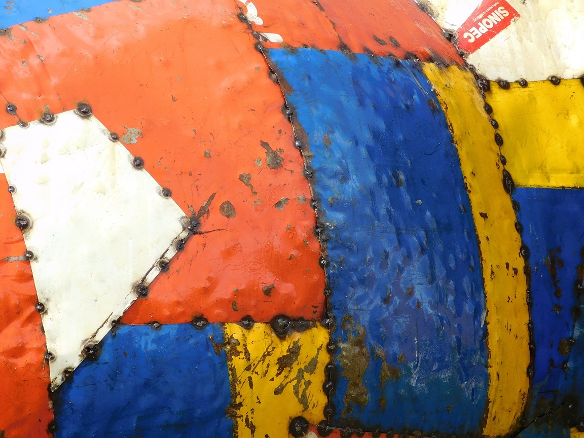 De zichtbare structuren, lasnaden en kleurrijke afwerking geven het beeld een authentiek en artistiek karakter.