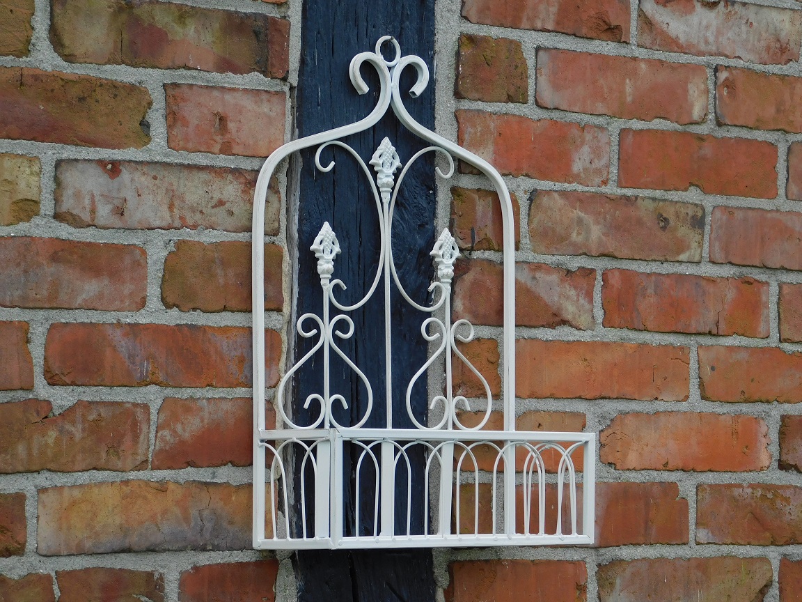 Voeg een vleugje elegantie toe aan je huis of tuin met dit prachtige wandrek in vintage white van smeedijzer.