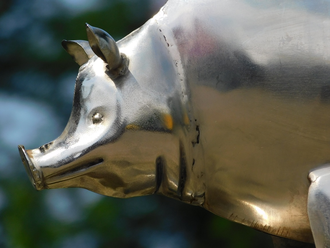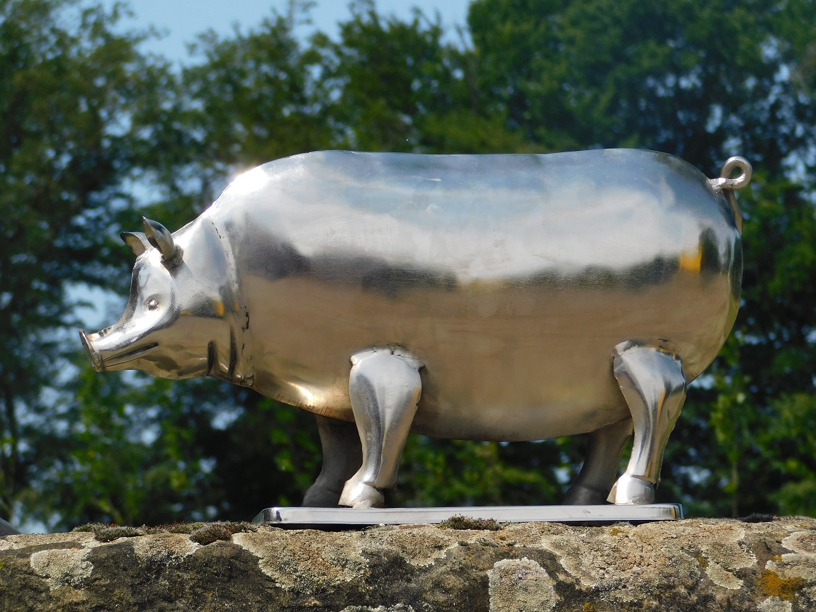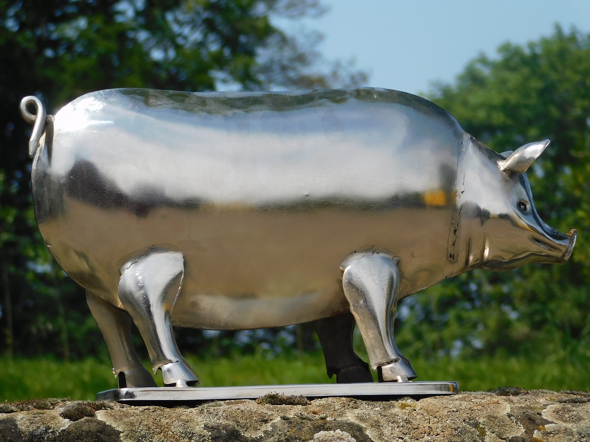 De gedetailleerde vormgeving en het gebruik van chroomkleur geven het varken een eigentijds en uniek karakter.